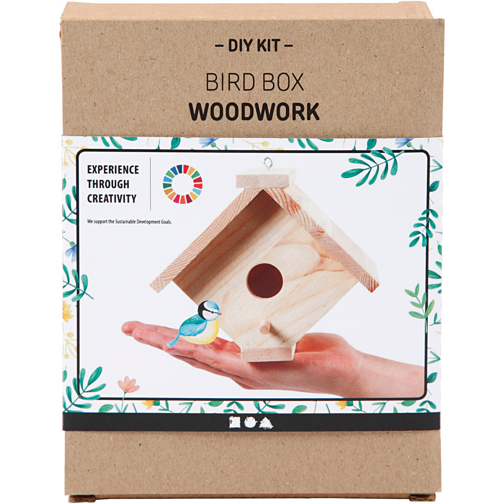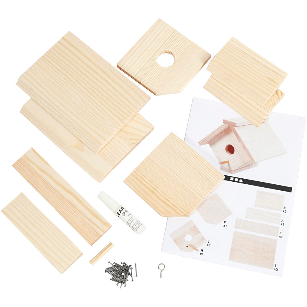 Material set for self-assemble birdhouse of light wood with 25 mm hole. Guidance included.