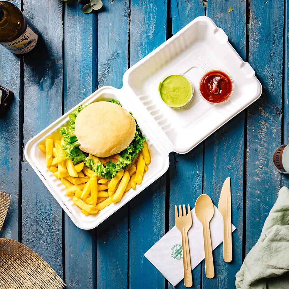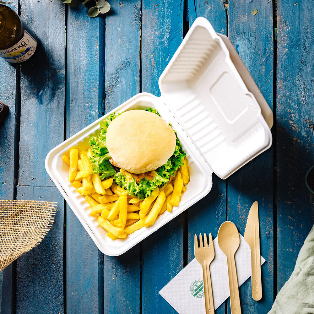 Take-away in robust trays: The trays are particularly suitable for fast food and finger foods. Even fatty dishes such as fried dumplings can be safely packaged. Because the trays are made of sugarcane, they are already robust by themselves and therefore do not need additional protection through a coating.