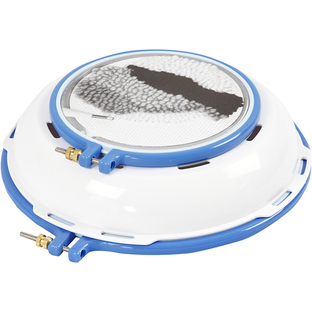 Practical and usable plastic embroidery bowl with metal buckle for attachment of embroidery fabric. Specially designed for embroidery with needle punch. Guidance included.