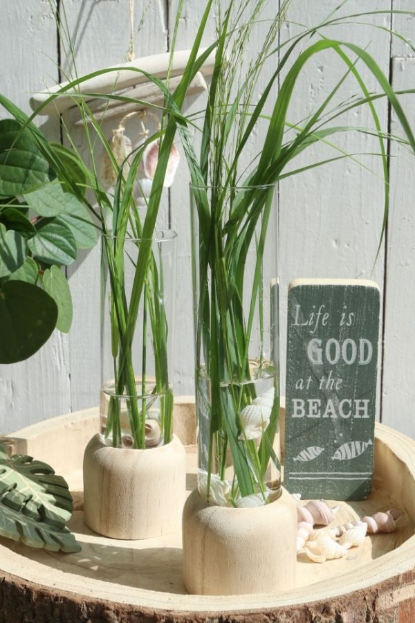 These high quality wooden bases hold a clear glass test tube. Ideal combination to hold a single flower and some green foliage. Buy 3 or 4 pieces to decorate your table or cupboard for example.
