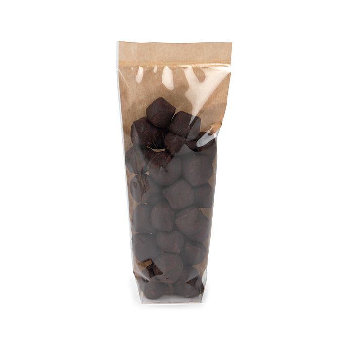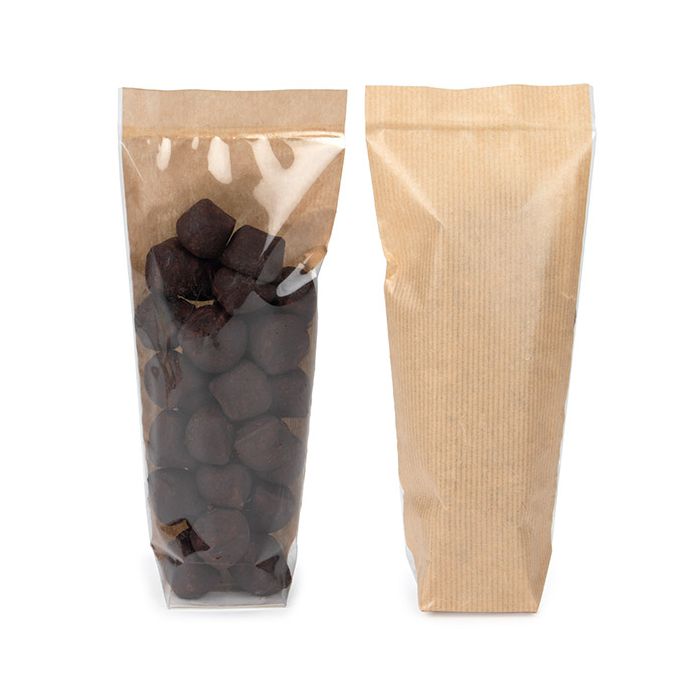Kraft Backed Flat Bottom Gusset Bags offer a unique and upscale packaging option for lightweight items like candy, chocolate covered almonds, gummy worms, and more. FGKB20 measures 5.1 x 4.4 x 21.6 cm and has a clear front to showcase the items and a kraft paper back. The bottom features a white paper insert that has been added to the bottom of the bag for extra support. This bag is made from 85 micron food safe materials and can be heat sealed. Holds 0.5 lbs of product.