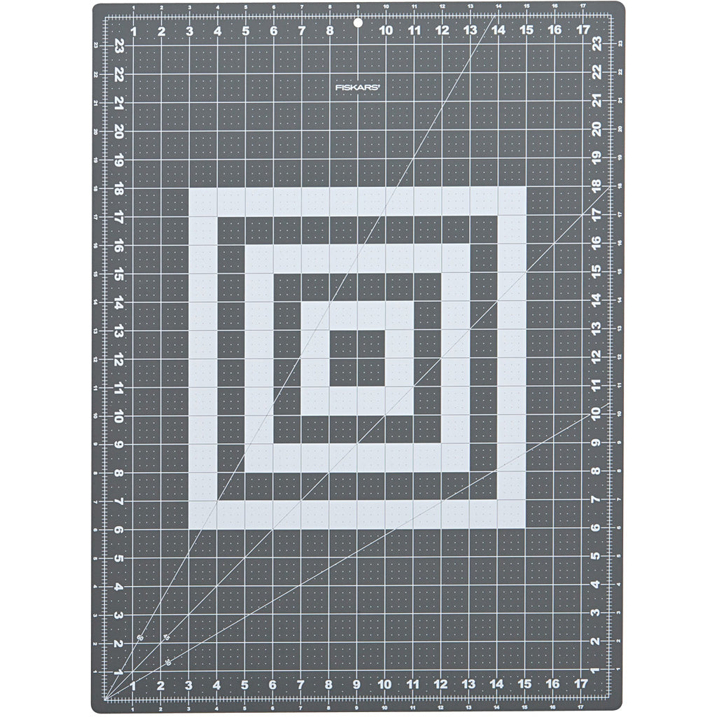 Fiskars long-lasting, self-healing, reversible cutting mat with measuring grids in cm, inches and angle lines.