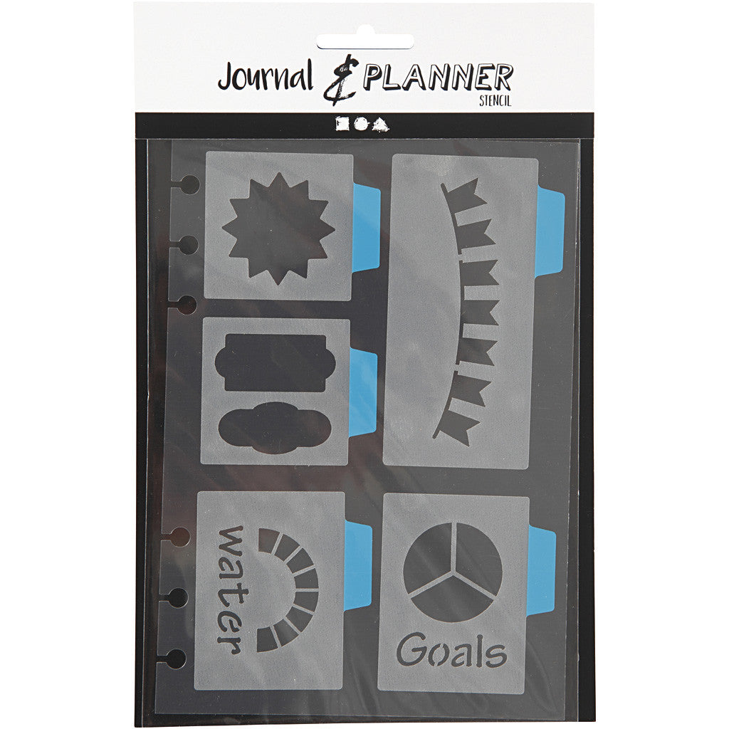 Self-adhesive, non-permanent plastic template with various shapes and designs suitable for bullet journaling. Comes mounted on acrylic with holes that can be inserted into and fits the planner item no. 192648-651. Wash immediately after use with lukewarm water