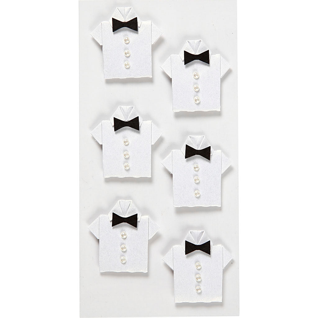 Stickers in the shape of a shirt with adhesive pad on the back for a 3D effect. The shirt is folded in origami with extra fine detail of white paper, has a black bow tie and little gems-like buttons.