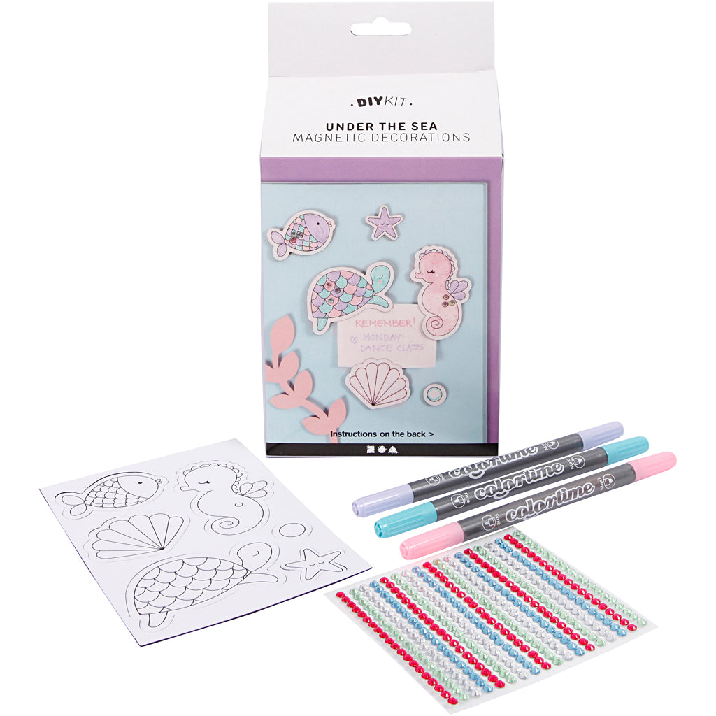 Material kit with materials for easy decoration of punched magnets with preprinted motifs. Inspiration included Contents: 1 sheet of 6 pcs. magnets, 3 Colortime markers and 1 sheet of rhinestone.